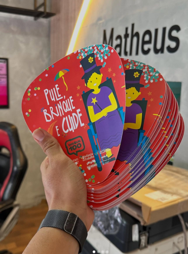 o abanador possui um layout criativo e bastante útil, fazendo toda diferença na divulgação da marca ou mensagem.